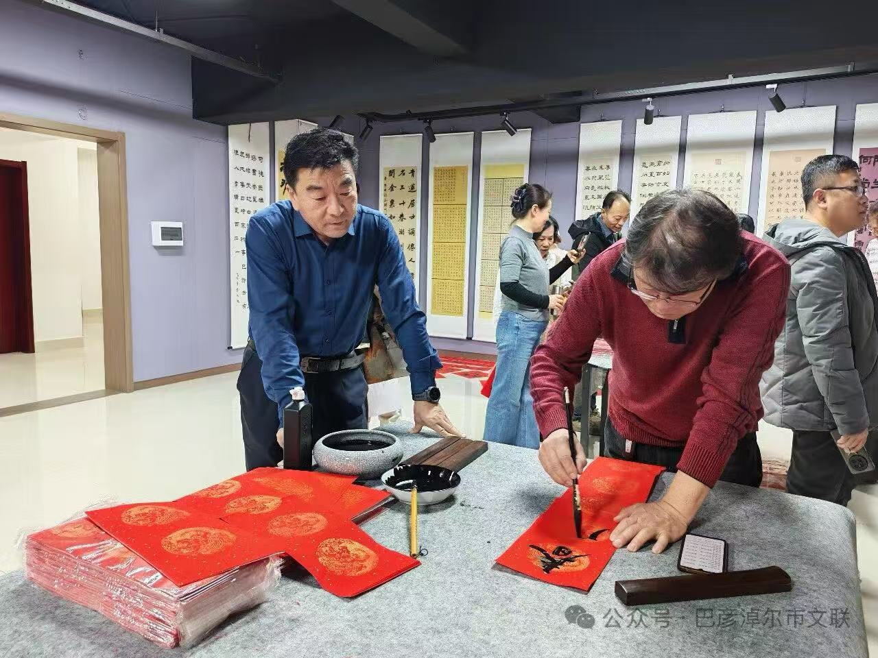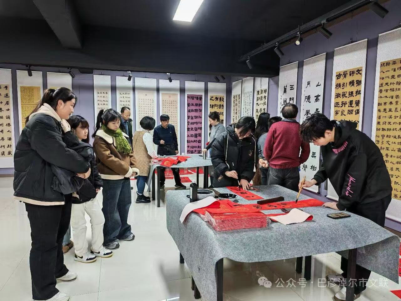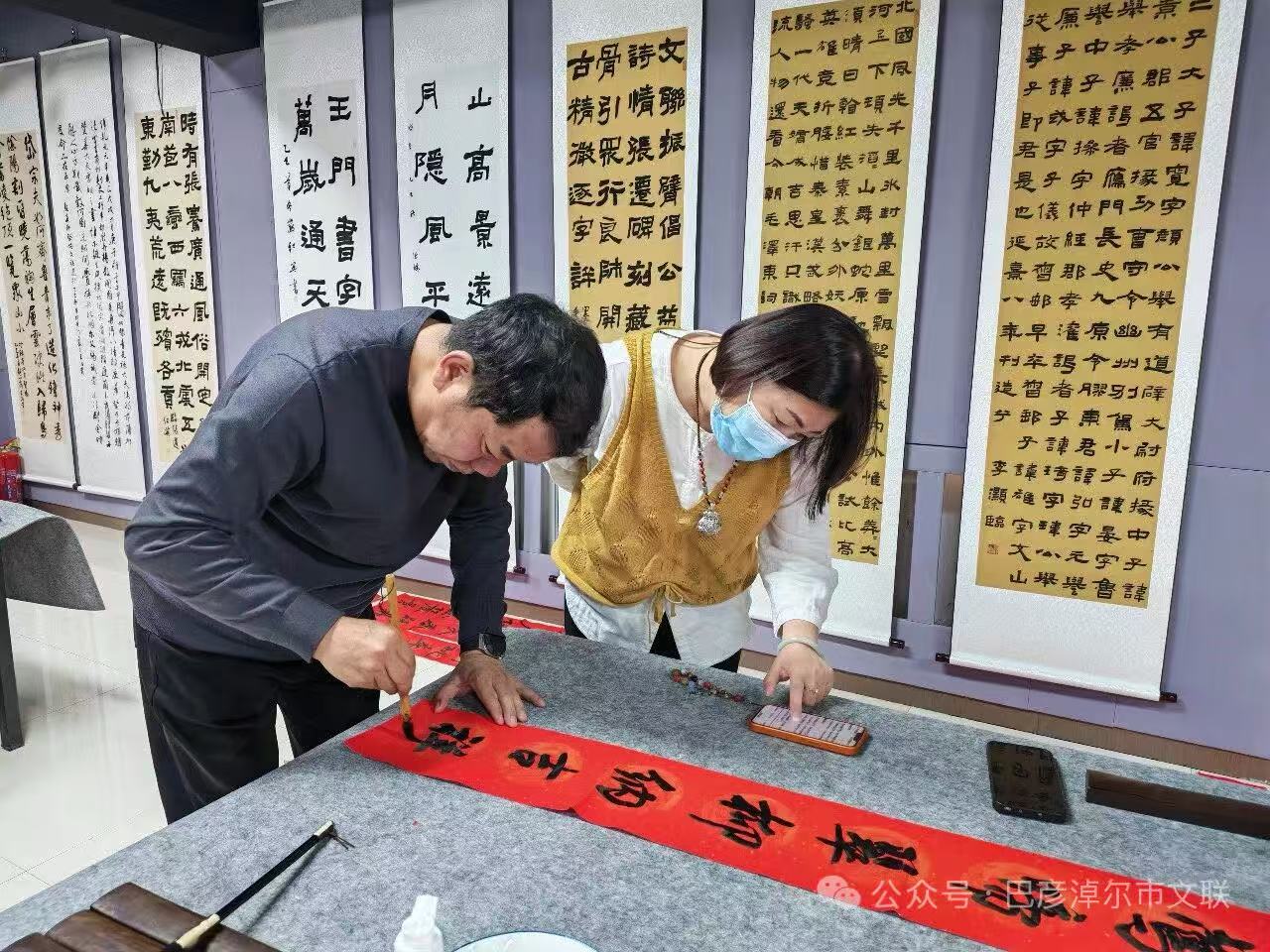 书法老师和学员们现场为大家写春联送祝